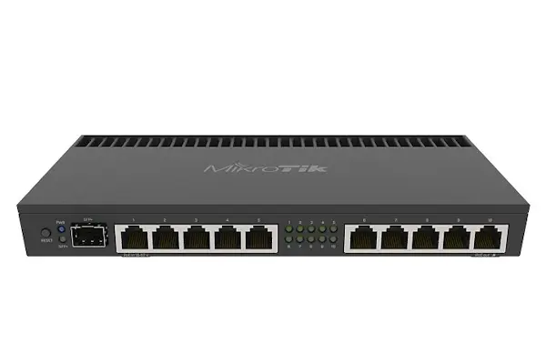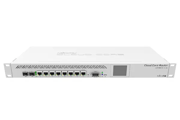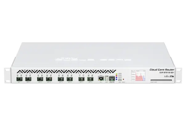 1U rackmount, 1x Gigabit Ethernet, 8xSFP+ cages, LCD, 72 cores x 1GHz CPU, 16GB RAM, Up to 120 million packets per second, 80Gbps thtoughput, RouterOS L6