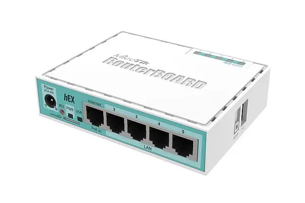 hEX is a five port Gigabit Ethernet router for locations where wireless connectivity is not required. The device has a full size USB port. This new updated revision of the hEX brings several improvements in performance.